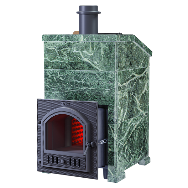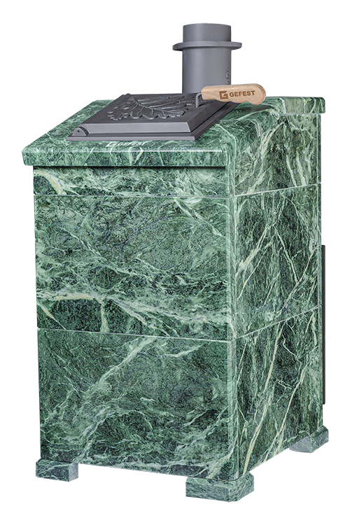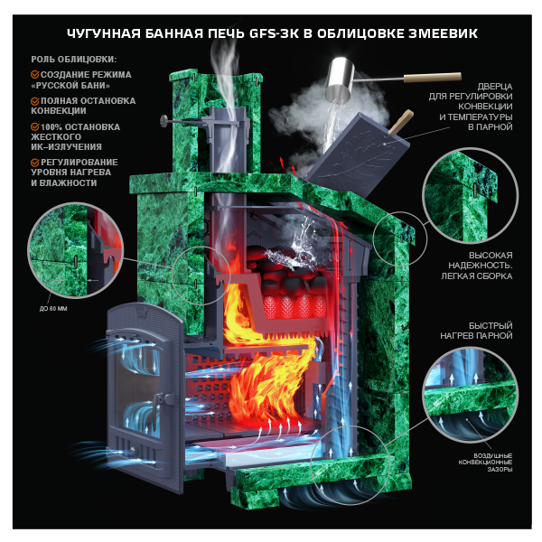 GFS-ЗК 40 (П) - печь с усиленной каменкой большей массы, с единым углублением внутрь топки для дополнительной укладки чугунного заряда. Теплосъемные шипы, со стороны горения пламени, в разы увеличивают площадь соприкосновения огня с каменкой и ускоряют передачу тепла, а также способствуют лучшему дожигу смешивая потоки пламени и воздуха поступаемого из воздушника. Эти усовершенствования значительно повышают мощность парообразования печи и выдают большее количество пара при непрерывной подаче воды. Каменка печей GFS-ЗК является незаливаемой.