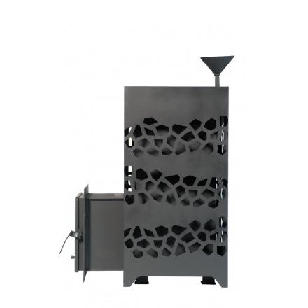 Дверца с остеклением не только добавляет печи стильный внешний вид, но и позволяет наслаждаться видом пламени, создавая атмосферу уюта. Протопка печи из смежного помещения обеспечивает удобство эксплуатации и экономию пространства в бане. Каменка является закрытой и комбинированной, что дает возможность наслаждаться как сухим, так и влажным паром.