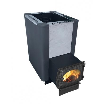 Печь оснащена дверцей с термостойким стеклом, что позволяет наблюдать за огнем и контролировать процесс горения дров. Протопка печи осуществляется из смежного помещения, что обеспечивает сохранность внешнего вида и чистоту банных помещений.