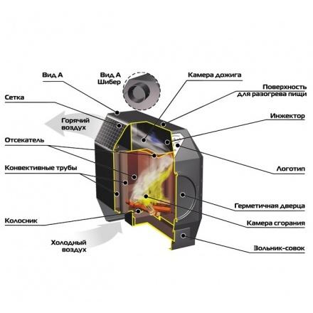 Печь оснащена варочной плитой, что делает ее еще более функциональной и удобной в использовании. Габариты печи компактные: 610х400х530 мм, а вес составляет всего 45 кг, что облегчает ее установку и транспортировку.
