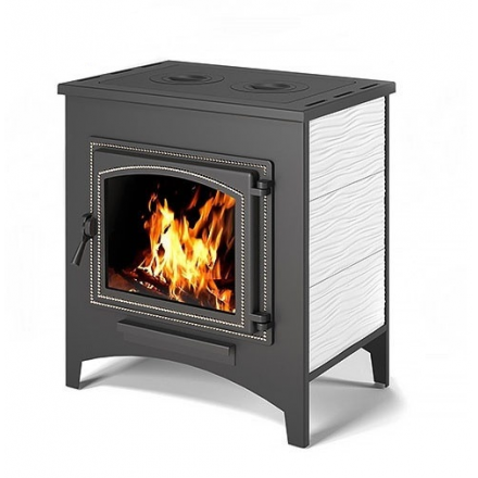 Печь оснащена стеклянной дверцей, что позволяет вам наблюдать за огнем и создает уютную атмосферу в вашем доме. Благодаря варочной плите и двум конфоркам вы сможете готовить вкусные блюда прямо на плите печи.