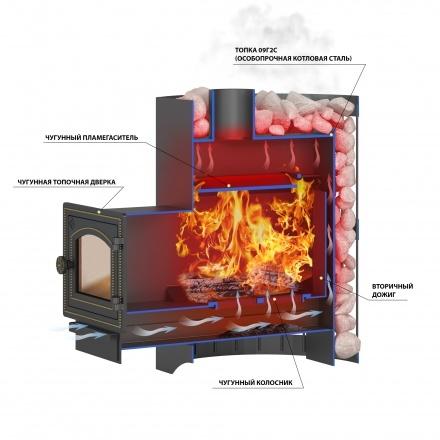 Эта печь работает на дровах, что делает ее экологически чистым и эффективным источником тепла. Материал топки изготовлен из прочной стали, обеспечивая долговечность и надежность работы.