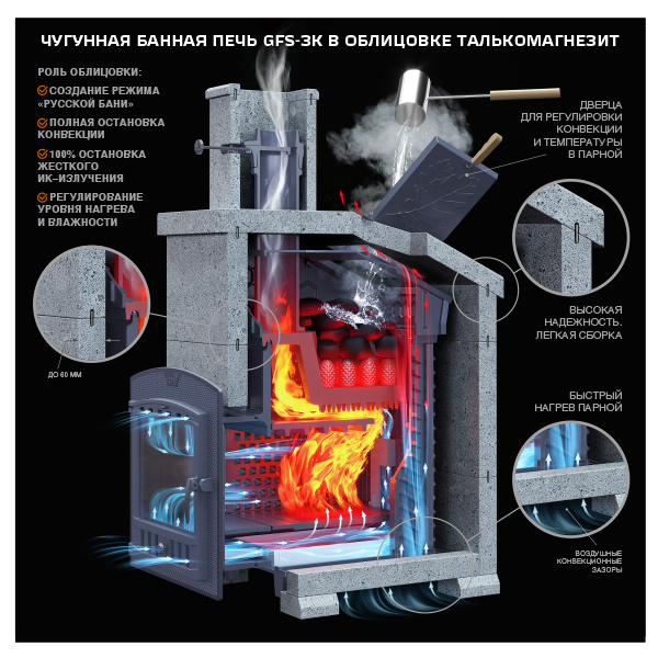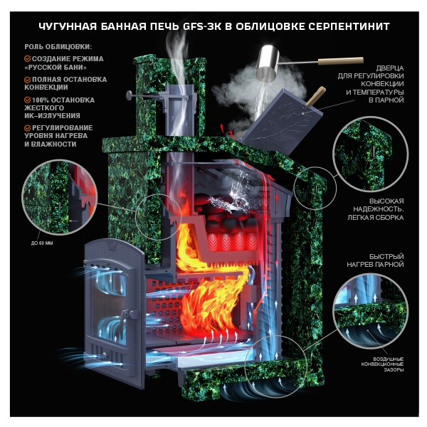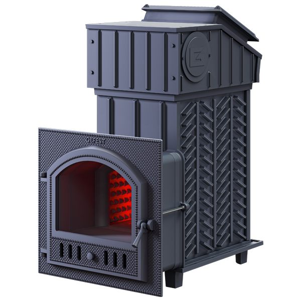 GFS-ЗК 45 (П) - печь с усиленной каменкой большей массы, с единым углублением внутрь топки для дополнительной укладки чугунного заряда. Теплосъемные шипы, со стороны горения пламени, в разы увеличивают площадь соприкосновения огня с каменкой и ускоряют передачу тепла, а также способствуют лучшему дожигу смешивая потоки пламени и воздуха поступаемого из воздушника. Эти усовершенствования значительно повышают мощность парообразования печи и выдают большее количество пара при непрерывной подаче воды. Каменка печей GFS-ЗК является незаливаемой.В комплект входит: